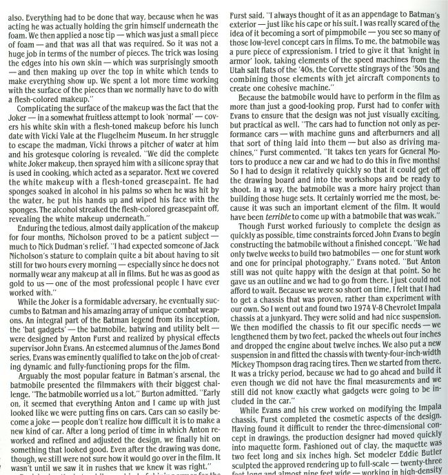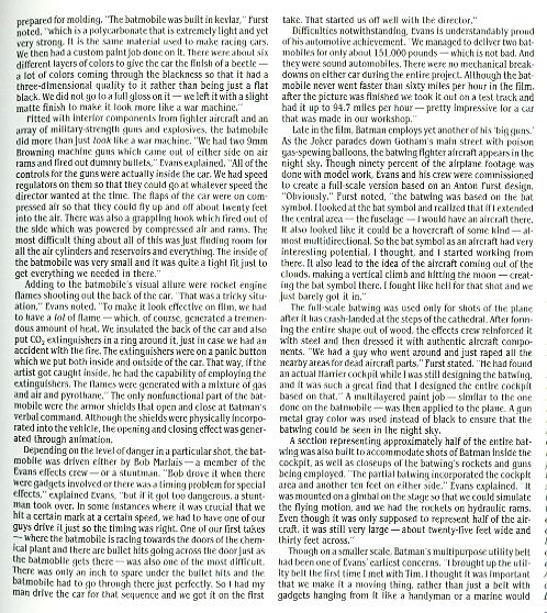 It's been longer than I planned... sorry. I have a crappy scanner - but anyway. Here are a few pics from the Cinefex on the 89 movie (only 1 behind the scenes shot - ut very cool.) Also, I included the text that deals with building the batmobiles. Very interesting.